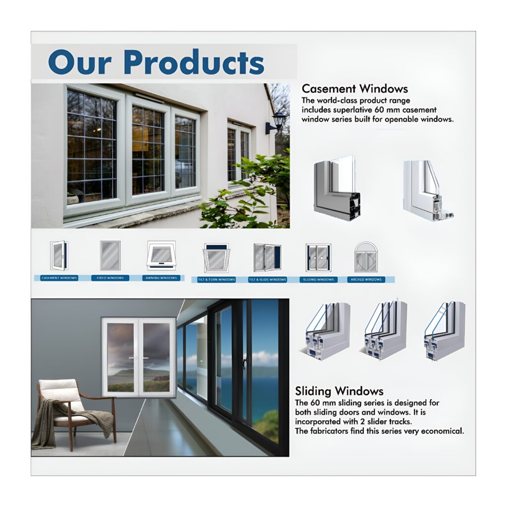 UPVC Window and Door – Durable, energy-efficient, and low-maintenance, UPVC (Unplasticized Polyvinyl Chloride) windows and doors offer excellent insulation, soundproofing, and weather resistance. Ideal for modern homes and offices, they combine sleek design with long-lasting performance.